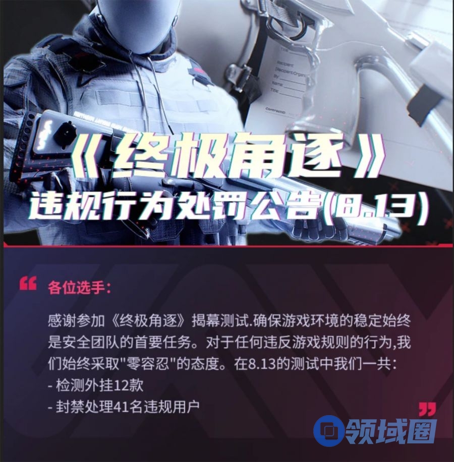 对于很多玩家担心的外挂泛滥的问题,制作人员表示将坚决打击,而且本次揭幕测试这几天每天都在封禁外挂用户并且公布封禁名单,8月13日更是公布了一大批封禁的外挂用户,被玩家们戏称为“杀疯了”。
