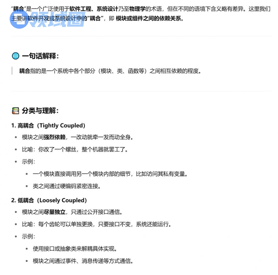 大体的意思是一个模块在整体结构中和其他模块的依赖关系,高耦合结构下,体系自身结构严密,但牵一发而动全身,对修改和拓展存在限制,低耦合下模块独立性较强,对拓展的支持程度更高。