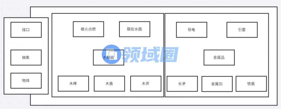 木头被赋予了“被火点燃”接口,所有木制物体都可以被点燃;火焰被赋予了“被水浇灭”接口,任何形式点燃的火焰都可以被水熄灭;金属品被赋予了“导电”接口,不管电是如何产生的,金属品总会进行相应。