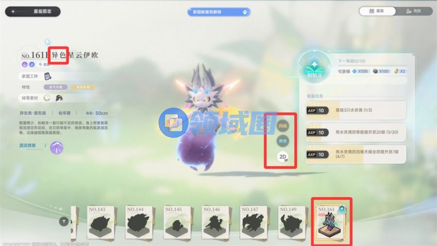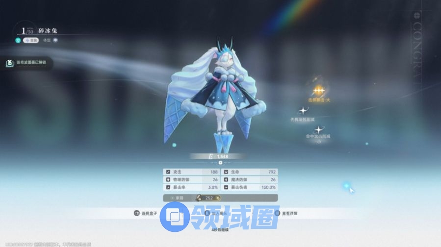3.多种条件随机刷取的被动词条;每个奇波在经历收服解锁图鉴、成长、养成、升级等阶段都会解锁1——4个被动词条的加成,词条按照白灰色、金色、彩虹色等划分,例如笔者解锁奇波碎冰兔的图鉴时,就刷出了2白+1金的词条。