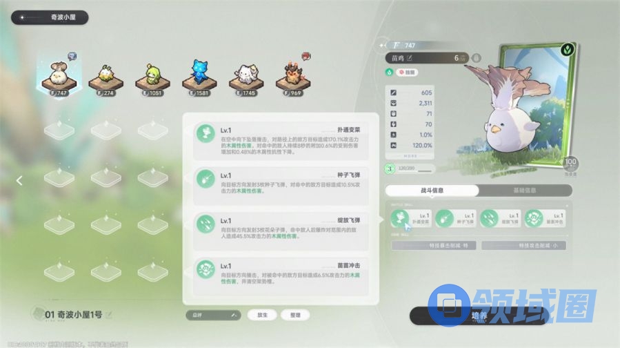 首先,作为玩家战斗的伙伴,奇波自动+手动触发的4大技能包含了很多提升玩家输出、增减BUFF的内容,以游戏最常见的奇波伙伴苗鸡为例,它的四个输出技能不仅包含了木属性的伤害,其次还叠加了持续8秒的0.6%增上,以及0.48%的木属性抗性下降,并能清空敌人架势槽。