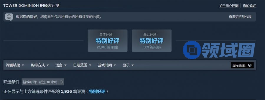 作为一款卖相平平的小成本游戏,无论是画面、音效乃至操作体验,《Tower Dominion》都算得上是毫无亮点——然而,尽管在Steam商店页面中差评并不罕见,但只要打开“游戏时间”统计项筛选一下,立刻就会发现,至少60%以上留下过评论的玩家,游戏时间都在10个小时以上。