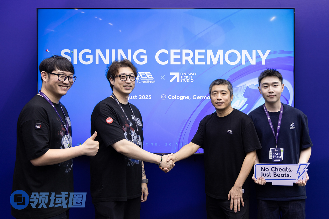 (合作仪式现场:左一、左二为Oneway Ticket工作室代表,右一、右二为ACE代表)