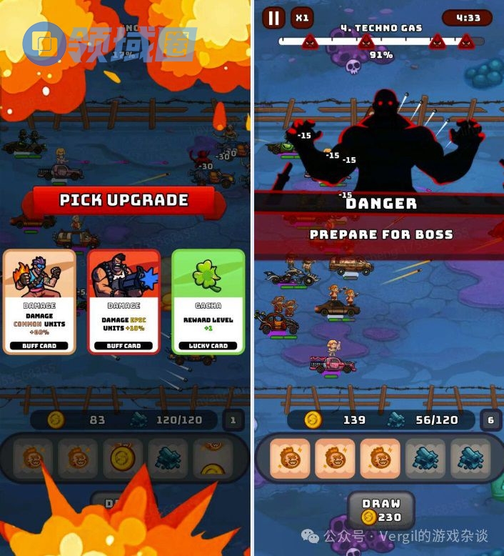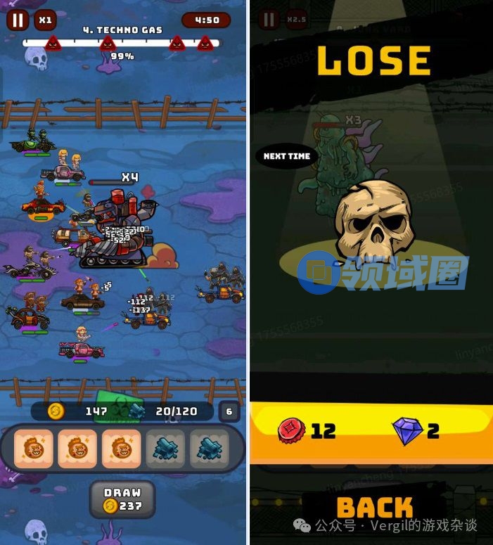 - 直观的核心战斗:核心玩法为横版对冲型塔防,火力不足时己方战车会被敌人击破,马太效应明显,战斗正负反馈都非常直观