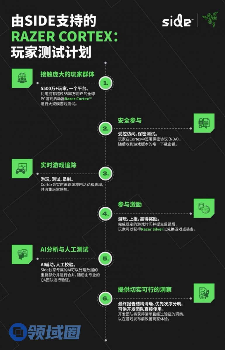Side首席技术官Harlan Beverly博士表示:“Side与Razer的此次合作将永久性地改变玩家测试的范式。对开发者而言,这意味着以相同或更低的成本获得更多测试者与更长的玩家测试时长;对玩家而言,他们能比以往任何时候都更贴近开发进程;对QA团队而言,这为他们增添了一个全新的工作维度。