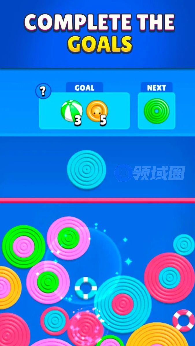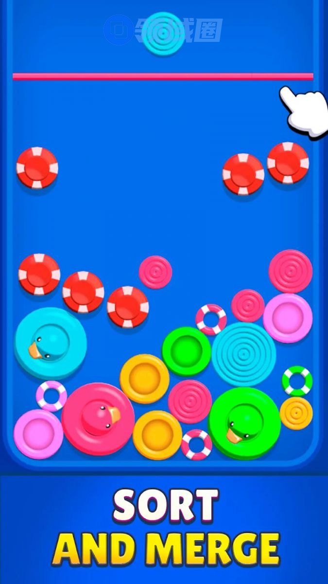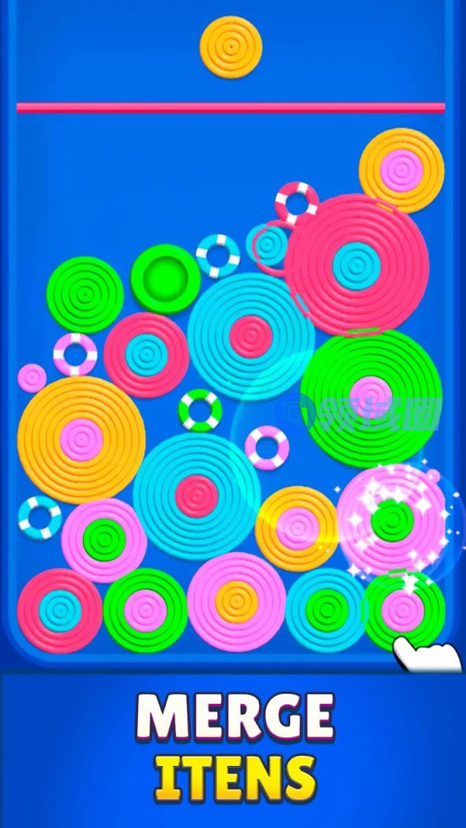 介绍:玩法是合成大西瓜的变种,合成橡皮筋。就是两个同色相同等级的球相碰后2合1升级为更高级的,不过用橡皮筋球的包装增加了一定的弹性强化和ASMR质感。