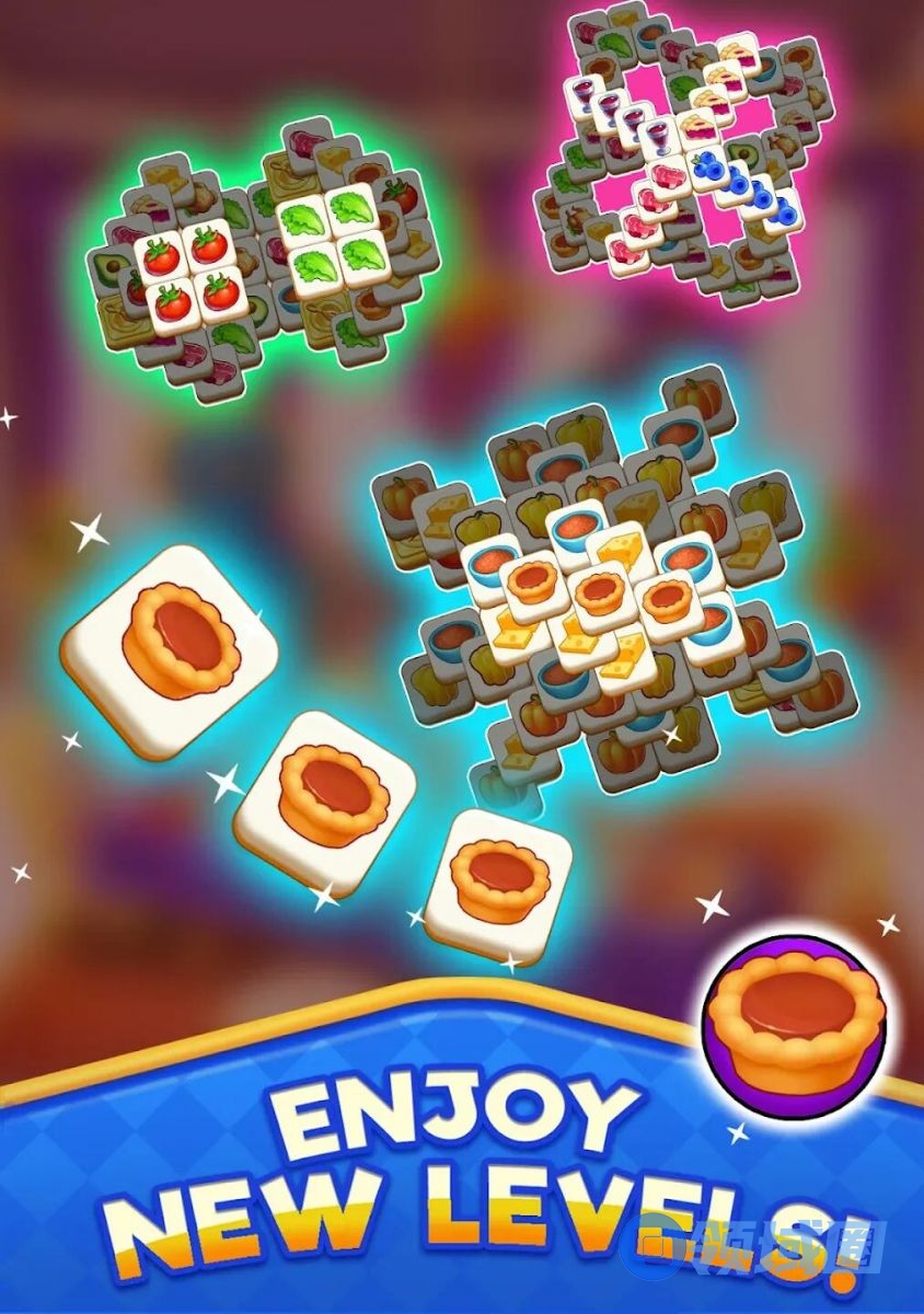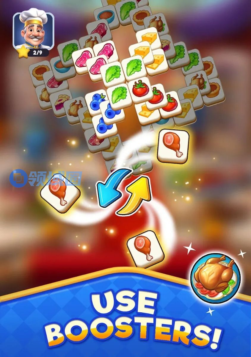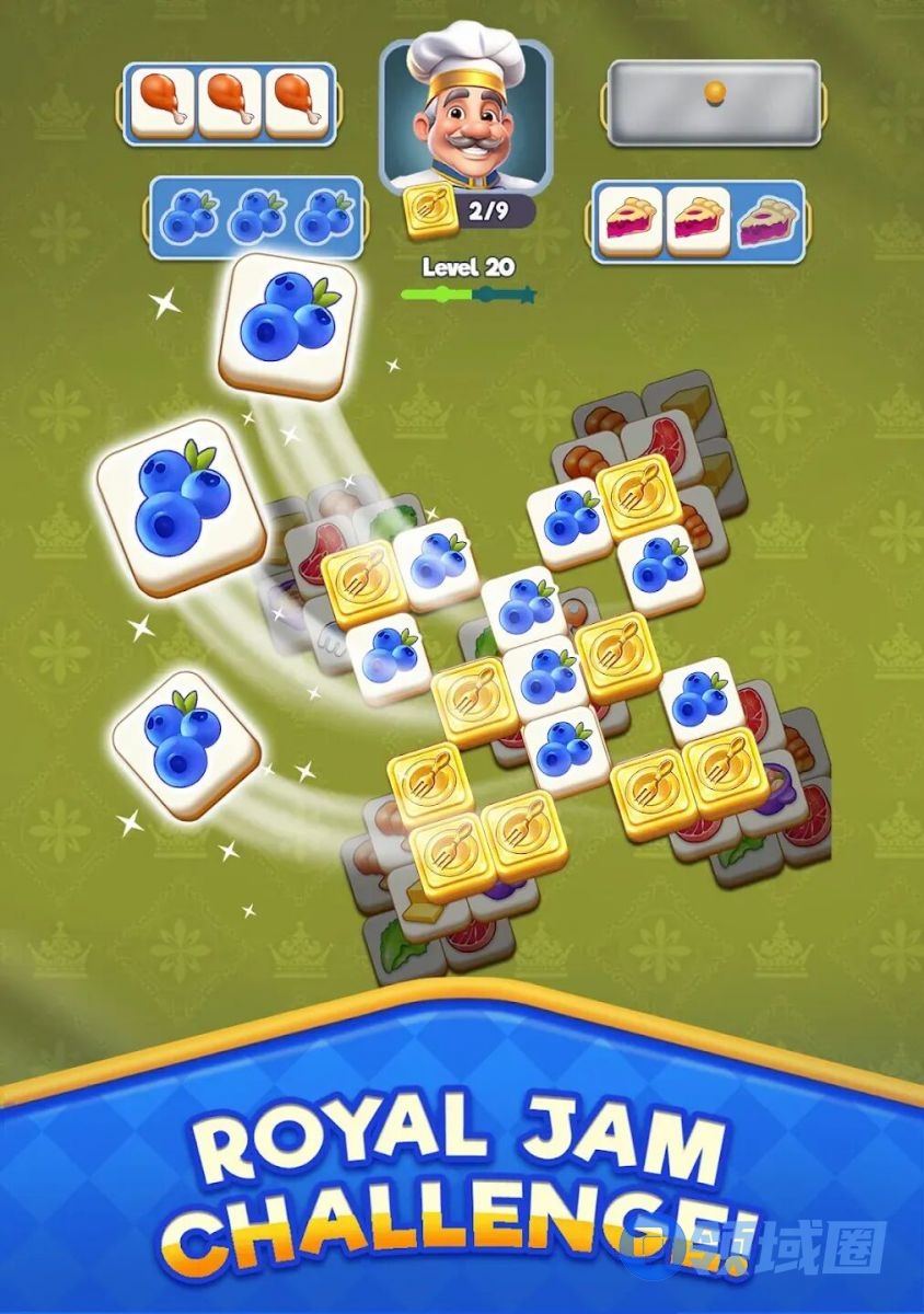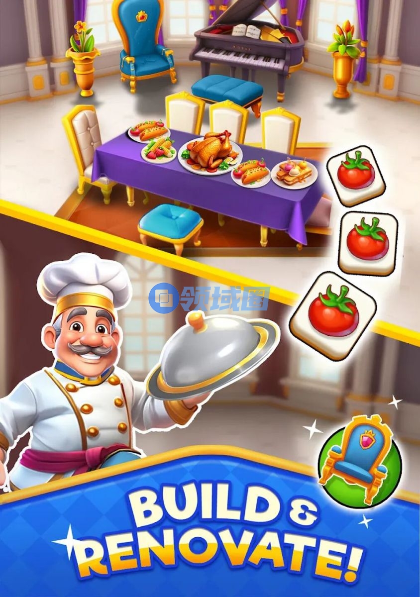 介绍:外围是RM-like装修,玩法部分是一个食物题材的Tile Match,由于玩法题材是宫廷厨师做饭的题材,所以玩法包装上额外增加了一个上菜盘的表现,就是把7格子的消除,改成了5格子双订单的消除形式,从玩法感受和表现包装上都感觉更生动了一些,整体玩起来算是比较用心聪明的表现形式了。