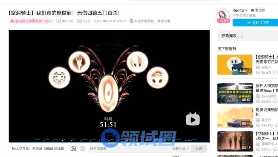 而且值得注意的是,《空洞骑士》的难度其实非常高,以至于挑战游戏的无伤成为了长期的一个热门话题,也使得游戏经常因此而出圈,例如国人玩家Remto丶于2022年4月22日达成了该作的全球无伤四锁五门首杀,使得这款游戏再度出圈火爆了一把。