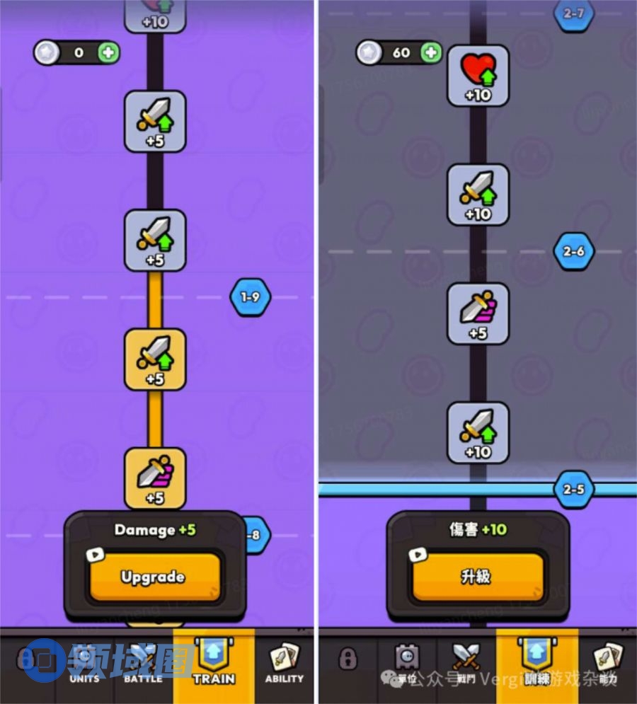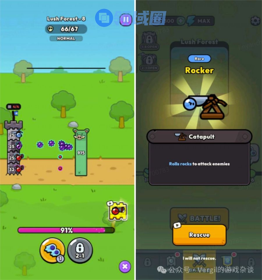 - 战斗作为融合型塔防,美术表现直观,在玩法中加入堆叠防御塔元素,并在横向防守中引入了Y轴概念,有效丰富了策略维度