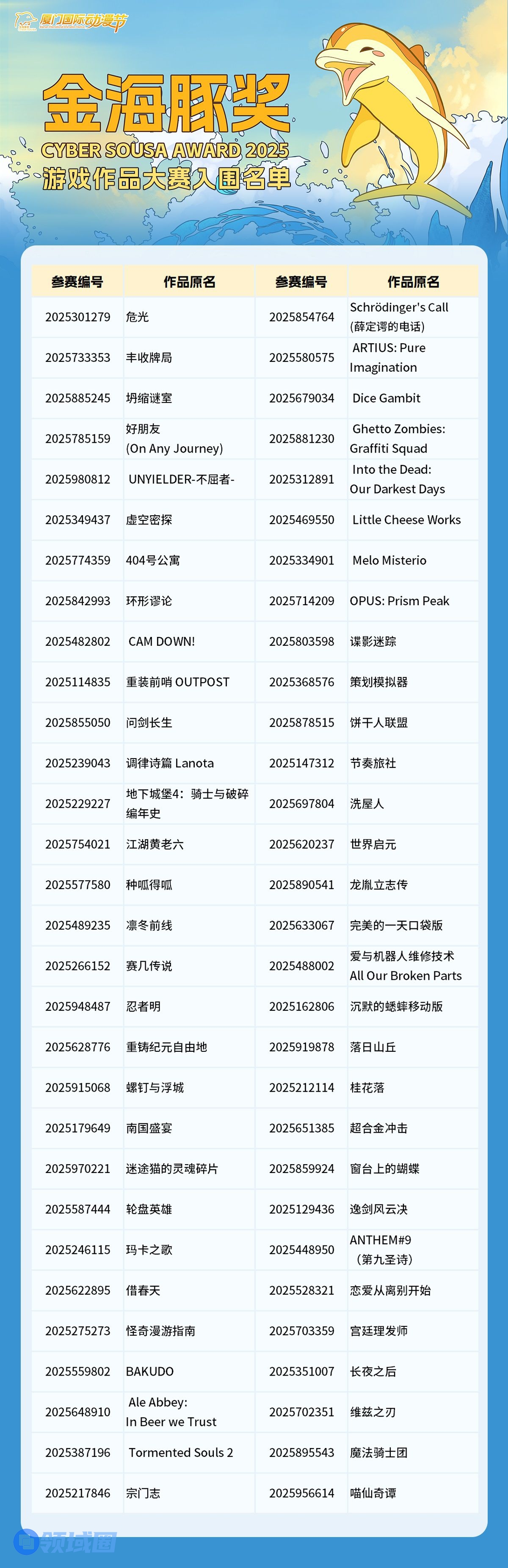 根据2025年第十七届厦门国际动漫节“金海豚奖”游戏作品大赛评选章程和细则等有关规定,经专家评委初评,共有60部作品进入终评。