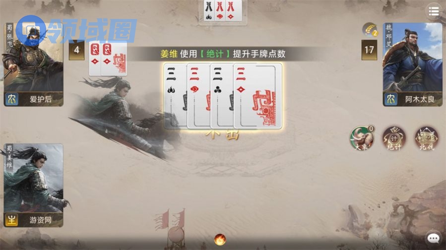 具体来说,《百将牌》的武将技能涵盖了支援、干扰、弃牌、印牌、牌权控制、过牌、反击、特殊功能等多种定位。以姜维的技能效果为例,姜维在选择不压牌的情况下,可以弃置手上最小的一张牌,直到弃置到只剩1张后,牌的点数会随机变大,变成大王后的下一变牌会转变成4个3。