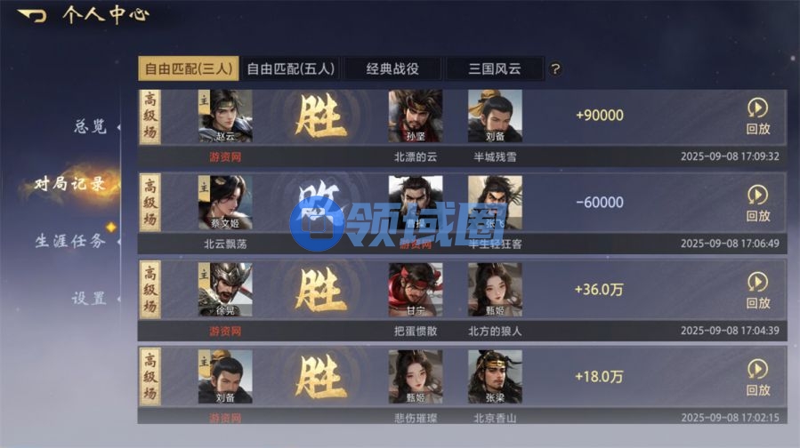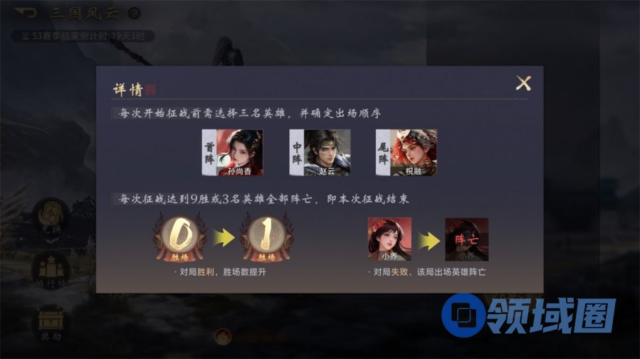 排位玩法「三国风云」锚定了喜欢竞技的玩家群体,玩家可选择3名英雄征战,当征战达到9胜或者3名英雄全部阵亡时结算天梯分,以赛季制的形式带来分数竞技快感。
