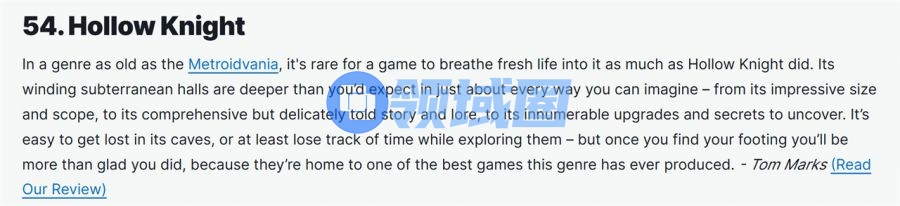 一个更有趣的事实是,在2021年及往后的媒体评选中,《空洞骑士》频繁出现在百大、数十大游戏名单之列。