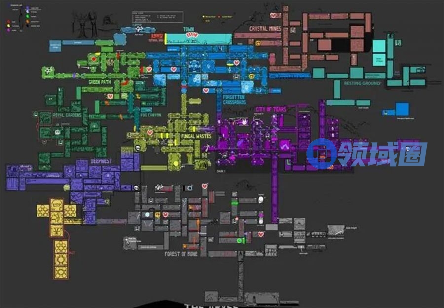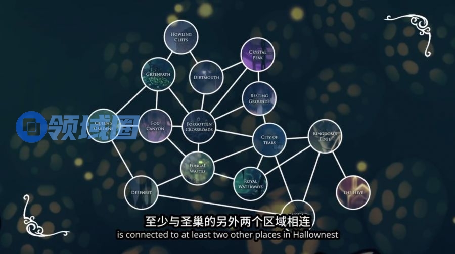 它显现出了与传统的银河恶魔城截然不同的一面,后者“倾向于解谜式地慢慢解开缠绕世界的一个个结,一环扣一环”,而《空洞骑士》则摒弃关键锁的概念、强调能力的复用性,进一步放大游戏地图的开放性。