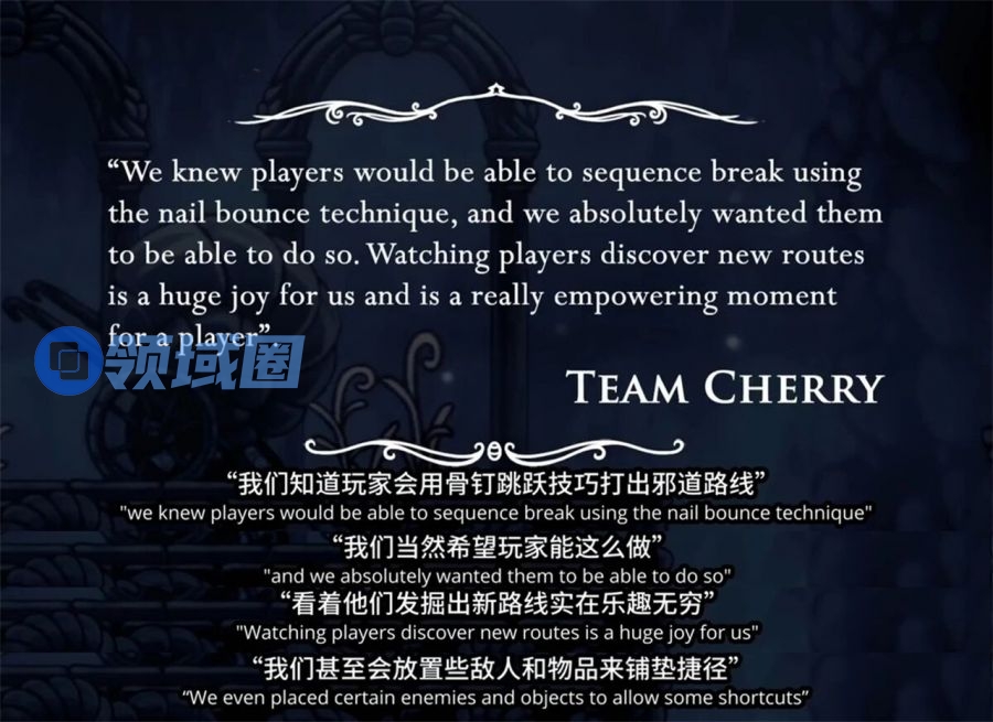樱桃组的开发模式,可能是多数业内开发者口中的典型反例,任天堂倡导为游戏做减法,岩田先生曾表示“比起贪心地这也要那也要,要懂得做减法才是创造。”其主张当核心做到到极致后,可能性自然会浮现。而樱桃组则喜欢给游戏做加法,想法设法地将颅内风暴化为现实,不断扩大游戏世界的边界,他们执着于游戏细节,为《空洞骑士》中武器穿透石层的长度而反复调试。这同样是个成王败寇的故事。