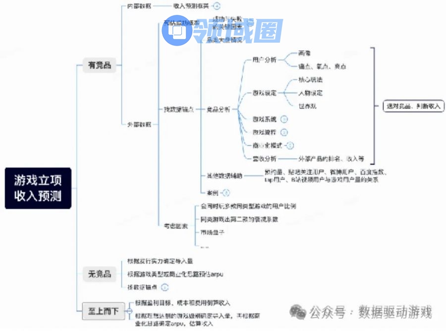 关于立项阶段的收入预估方法,可参考《游戏立项期的收入预测(一)》与《游戏立项期的收入预测(二)》。本文结合《代号C》的具体情况,基于竞品数据、发行商实力以及商业化方向,从多个维度对 ARPU 等关键指标进行了推算。预估框架参考下图。