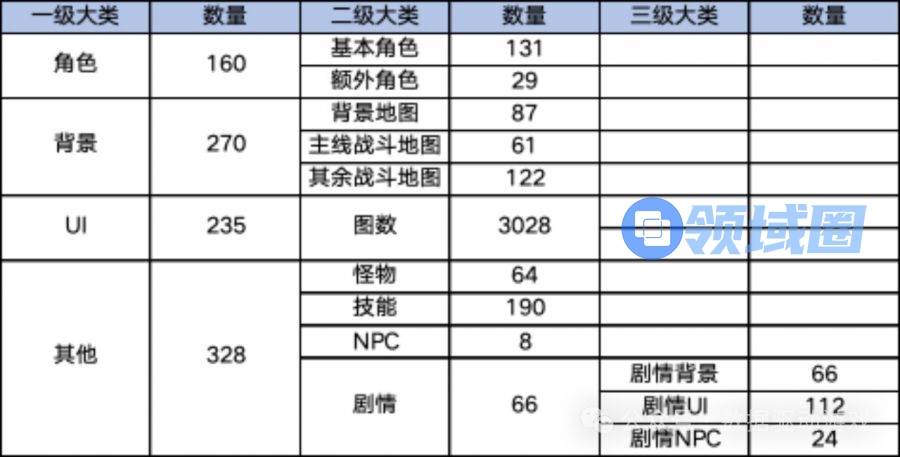 以《代号C》OB版本的美术素材量为例,分析师可列出目标竞品在同阶段的素材数量进行对比。虽然立项初期难以对美术质量做准确判断,但内容产出量可以作为达成收入目标的先决条件进行分析。
