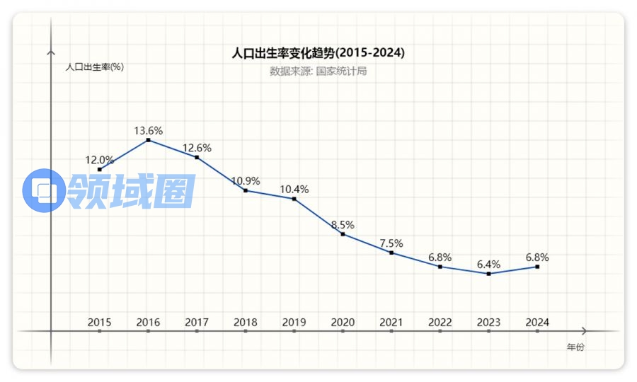 据国家统计局2015-2024年数据,人口出生率总体呈现加速下降趋势,这与我们观测到的其他发达国家的情况类似,即一个国家在进入工业化社会后会不可逆的陷入生育率陷阱的情况。