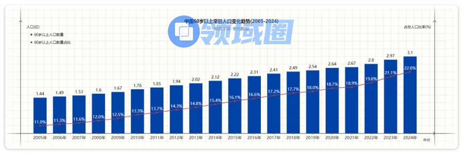 深度老龄化社会是经济发展停滞的恶性循环中最关键的原初动力,也是未来的几十年发展历程中国要面临的最严峻的挑战之一,下图是中国2005年-2024年60岁以上人口变化趋势图。