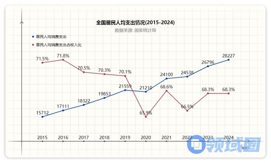 下图是全国居民人均支出情况,其中蓝色的线段表示人均支出的具体数额,可以看见,居民支出在逐步提升,但占本年收入的百分比是在逐渐下降的,其中2020年和2022年受疫情影响形成了两个坑,不过把这两个坑通过线性插值的方式填平,支出占收入的变化依然是呈现下降趋势,这张图很好的反映了人民对消费这件事变得更为谨慎了。