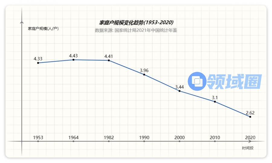 下图为1953年-2020年内中国家庭户规模变化趋势,可以看见,中国的平均家庭户人口在减少中。
