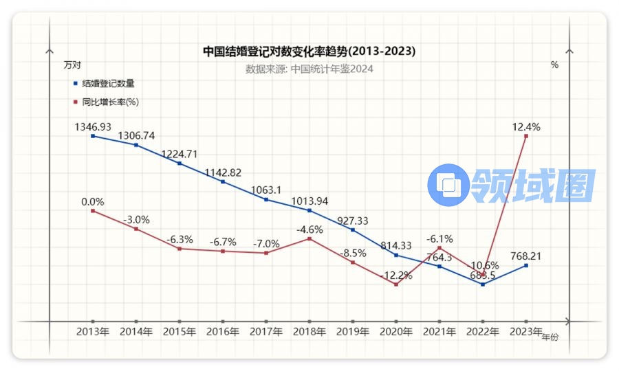 除2023年由于2022年疫情影响带来的数量反弹之外,这十年间的总体结婚登记数量变化趋势是在减少的。这两张图可以说明中国社会正在原子化。