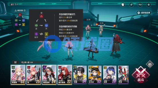 4、属性相性克制;游戏分为水火草(虚、异、理)三系互克+光暗(破序/恒定)互克的克制机制,三系互克的角色被称为原相角色,光暗(破序/恒定)角色则称为极相角色。一般而言,相性克制对手可以额外增加15%的伤害数值与暴击率;反之被对手克制则会降低30%的暴击率与效果命中,并额外降低15%的伤害结果。