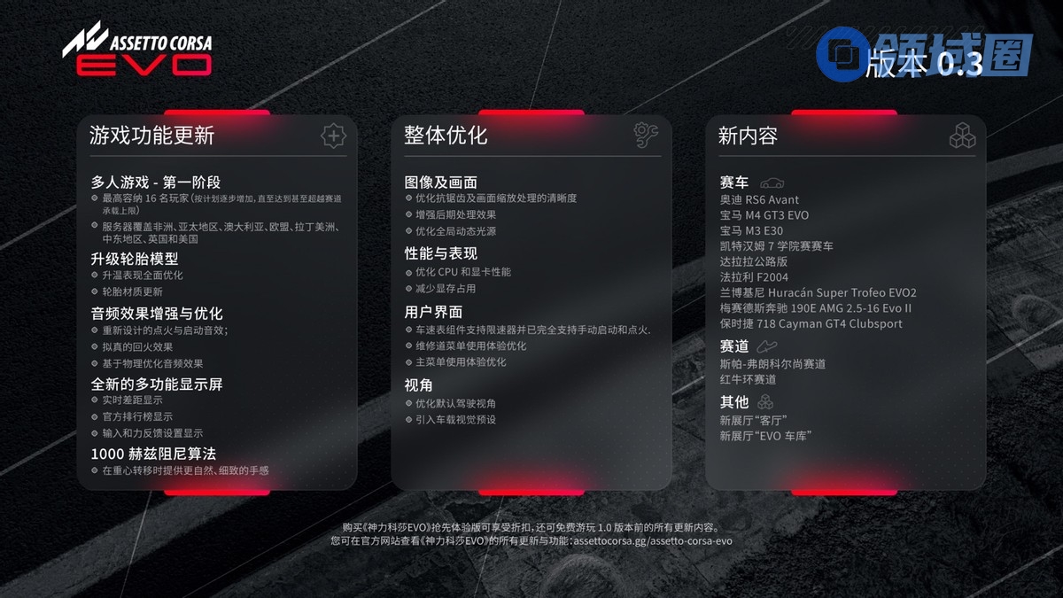点击此链接【https://assettocorsa.gg/assetto-corsa-evo-release-0-3-out-now/】了解的所有改进内容,包括AC EVO服务器管理(公共服务器与自定义服务器)的详细信息及全车款资料。