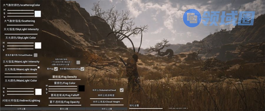 因为不确定黑神话有没有使用HDR贴图做为照明来源,我目测是没有。所以天光参数使用默认值也就是1,并开启实时捕获。使用直射光强度作为天光强度。
