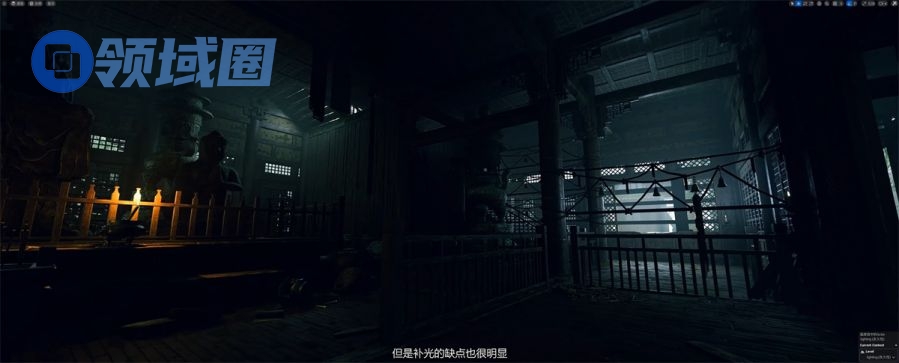 2.使用补光,在场景里加入补光,优点是美术效果可控,画面可以更好看。例如在场景里针对玩家动线设计一些合理的补光可以让角色细节更加丰富。黑神话也用了,最明显的补光就是他们给猴子身上挂了个灯。暗处自动开启,跟手电筒一样。这个做法不是很讲究,不建议其他开发者效仿。但是补光的缺点也很明显,第一,场景里突然出现一个没来由的光源其实从美学角度上讲是很突兀的,效果不和谐,需要大量的精力和一定的美术水准去调整补光与整体环境的融合问题。第二,增加更多的光源也会带来更多的性能消耗,需要进行大量优化工作。至少在5.5以前的版本,lumen对多光源的支持并不太好。