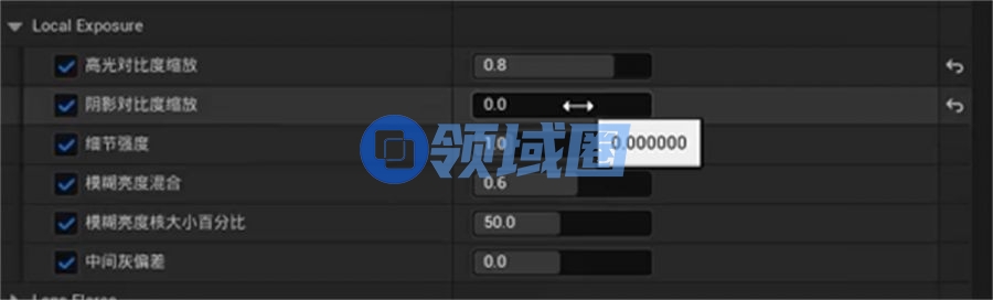 曝光设置上,室外曝光直接使用阴到多云的曝光值13.5,。也就是ev100max=13.5,min=6。我做了一个曝光补偿曲线用于控制一下明暗室内曝光表内的数据是5——7,这里取一个中间值6过度,降低了对比,让过渡更加平滑,以符合人眼观察效果。tonemmapping对明暗影响很大,尤其会导致室内过黑,所以我在局部曝光参数中修改了高光对比度和阴影对比度。当然直接改tonemapping也可以,但是我觉得改完会让颜色变灰,所以选择改局部曝光。