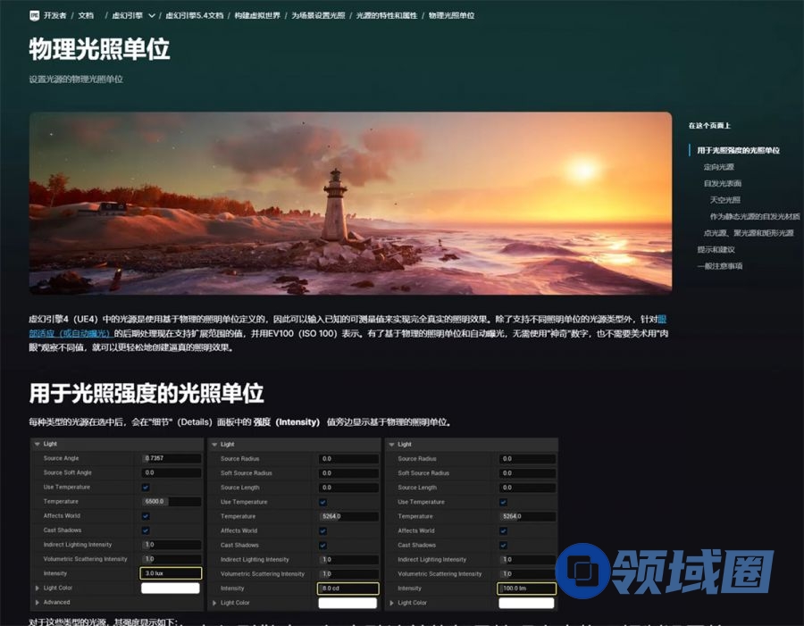 先看灯光单位,在虚幻引擎中,灯光默认单位都是按现实中物理规制设置的,灯光的单位有lux(光照度),lumen(光通量) ,candle(烛光)等,在官方网站有灯光单位的详细说明,这里不展开讲了。有需求可以自己去看。这里面最重要的单位是lux,也就是光照度。光照度决定了我们看到的游戏画面中的阳光强度。所有的灯光参数都有公式可以换算成光照度。