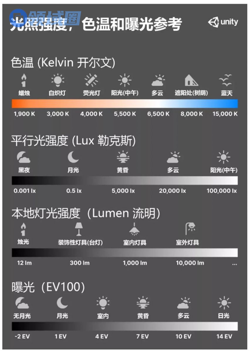 首先去找不同光照环境下的照度,这里可以看unity官方给出的参考数据。