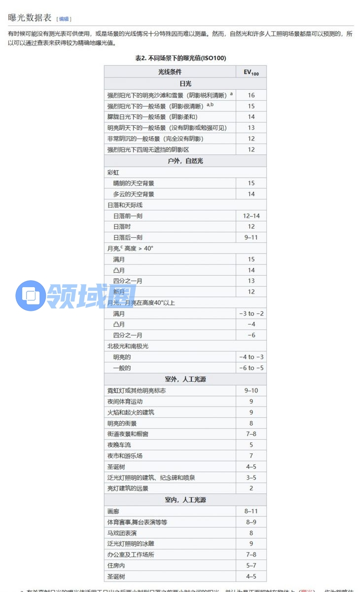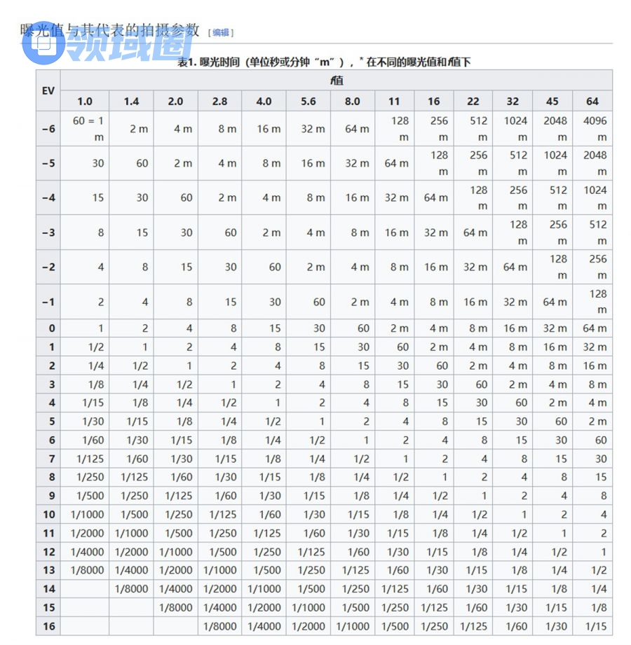 最后继续查曝光值和摄影参数的对应关系,这里同样引用维基百科的数据。