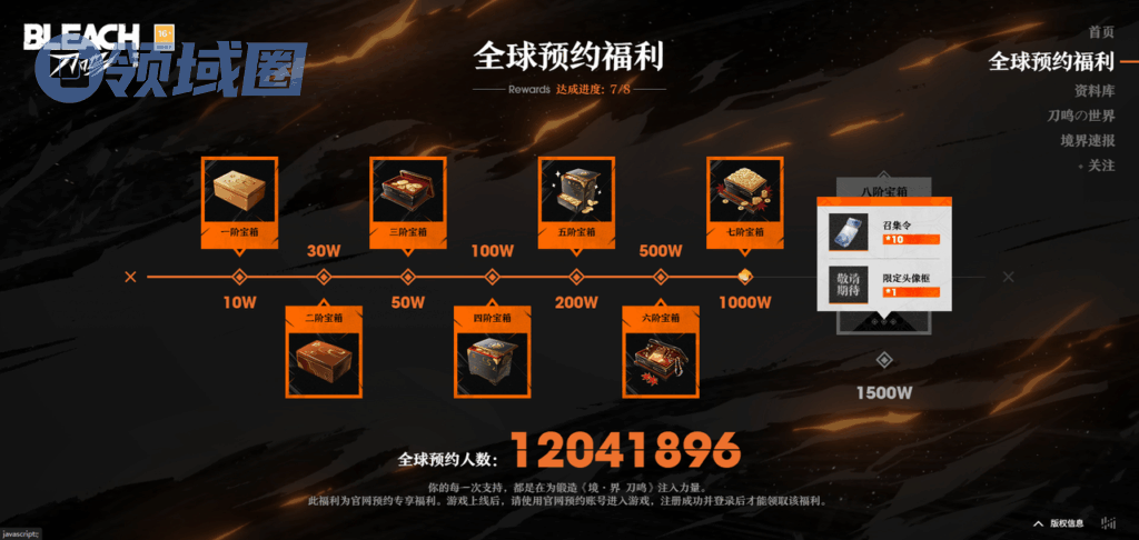 全球预约人数突破1000万!《境·界 刀鸣》特别追加第八档预约福利,静待各位死神代理人解锁——达成1500万预约,全员赠送:「召集令*10 及 纪念头像框」!现在即刻前往预约《境·界 刀鸣》,就能获得SR角色集结邀请函、稀有核心刻印、神秘预约礼盒等超值好礼!