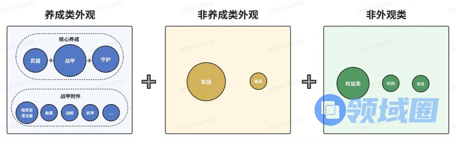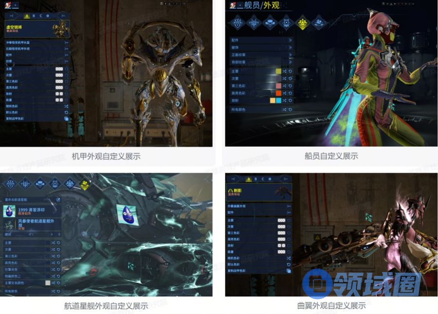 下面我们将以《Warframe》为主介绍,其余三款游戏作为补充。《Warframe》中,非数值商业化内容大致可以分为养成类外观、非养成类外观与非外观类三种。特别地,几乎所有养成内容,均有非常细分的非数值付费项与之对应。下面我们将逐一介绍:
