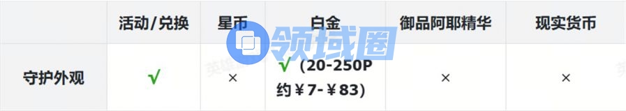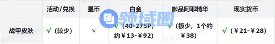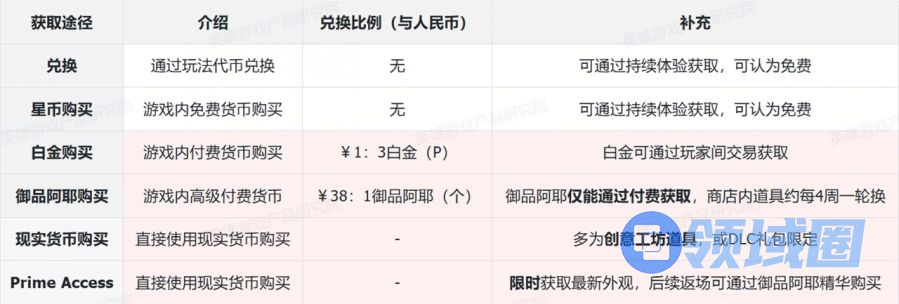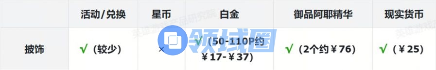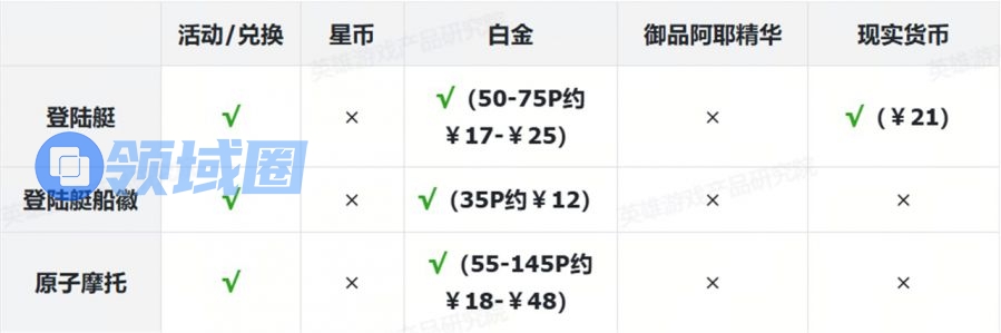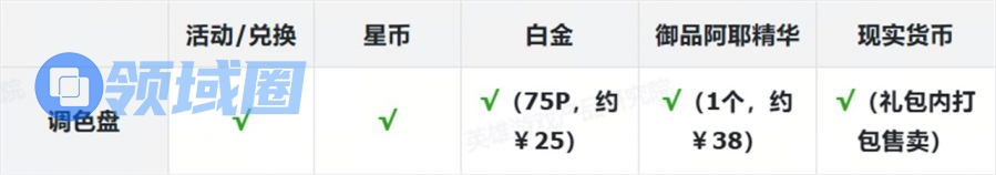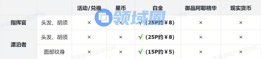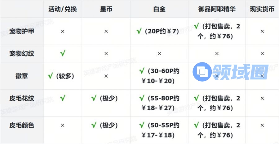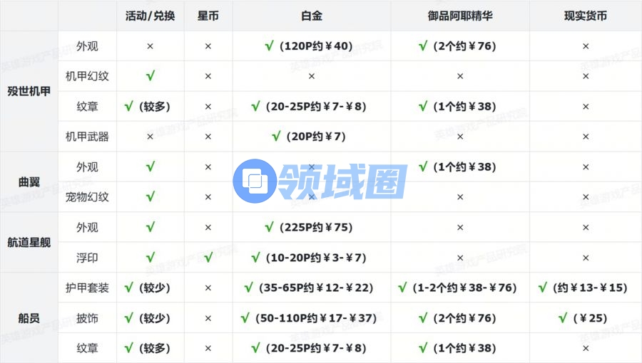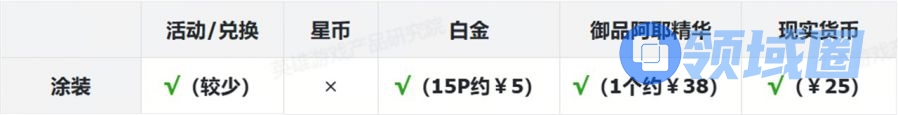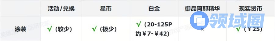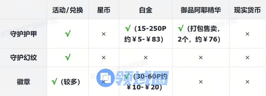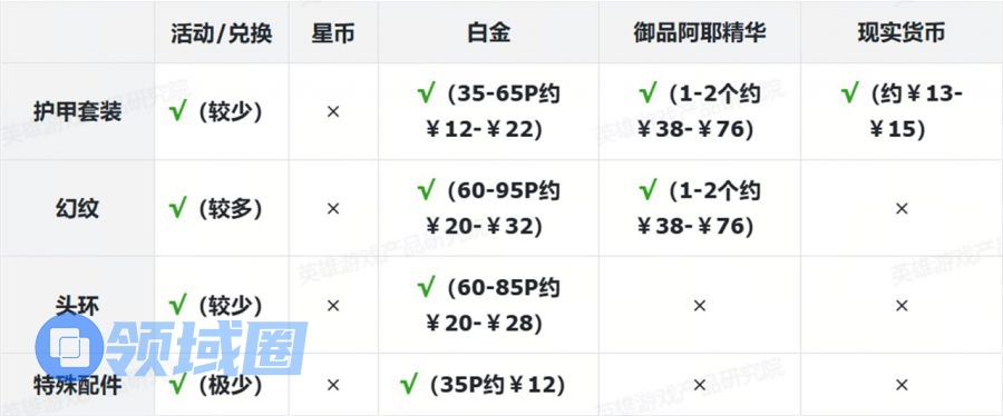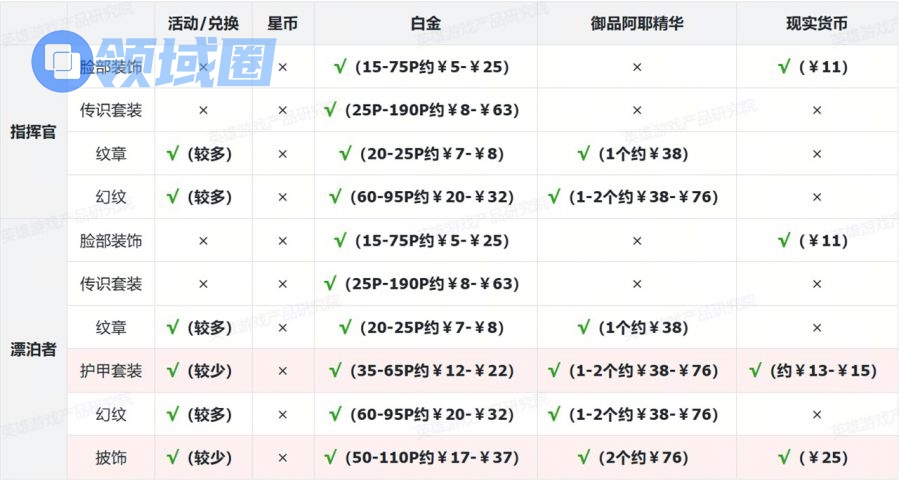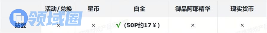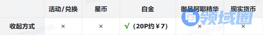 表格中标注红色部分为付费内容。为叙述方便,白金使用“P”为单位、御品阿耶使用“个”为单位,现实货币使用人民币¥结算。