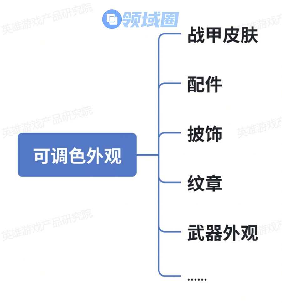 呈现形式:大部分外观有主要、次要、第三色彩与高亮色彩四种分色,技能颜色与部分弹道效果有可以分成放射与能量两种分色。特别地,放射与能量可以通过拼色的方式获取更多种自定义颜色。