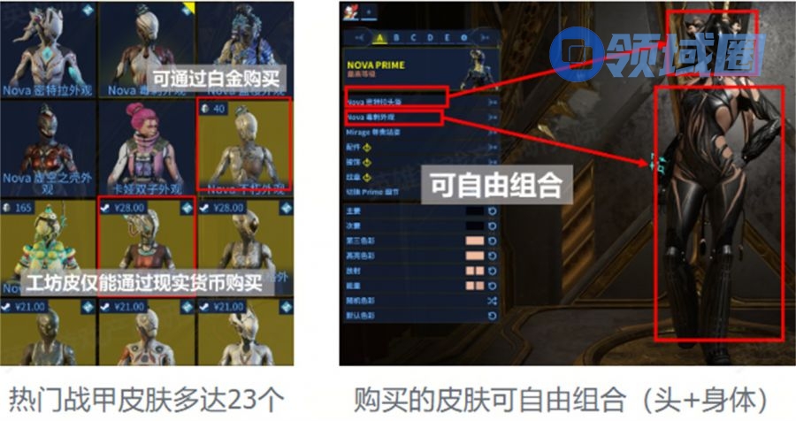 战甲皮肤数量非常多,且相同战甲的皮肤可自由组合,大部分可通过白金购买。得益于交易系统的存在,“肝白金”搬砖购买战甲皮肤成为部分玩家中期游玩的动力。