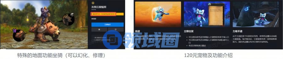 在《魔兽世界》中,部分商业化内容也围绕坐骑与宠物展开。特别地,为增加购买的驱动力,游戏中除外观外,也增加了部分便利性功能。价格为¥45-¥120。