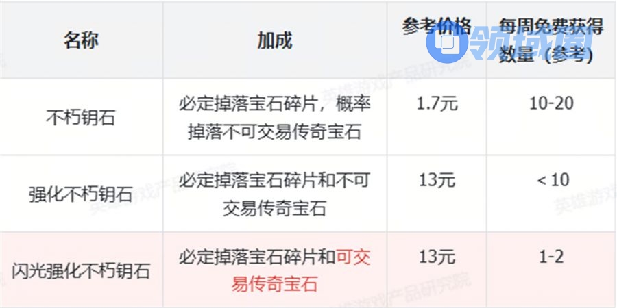 当前,玩家可以购买的钥石共分为3种,不朽钥石、强化不朽钥石与闪光强化不朽钥石。可参考下表: