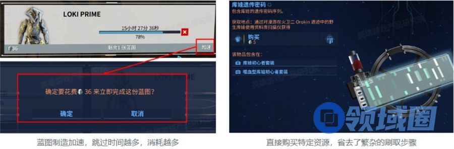 游戏中,几乎所有武器、战甲、消耗品道具均需消耗12-72H蓝图制造,想要快速体验跳过等待时间需要支付加速费用,加速费用为10P-50P不等,约¥3-¥17。