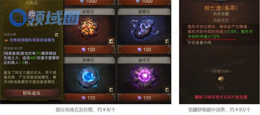 在《暗黑破坏神:不朽》中可通过付费购买大量获取洗炼石,获取随机属性(免费只能限时定量获取)。约¥8/个。特别地,觉醒石仅可付费获取,约¥83/个。可新增装备属性,但需要装备上镶嵌10级的传奇宝石。
