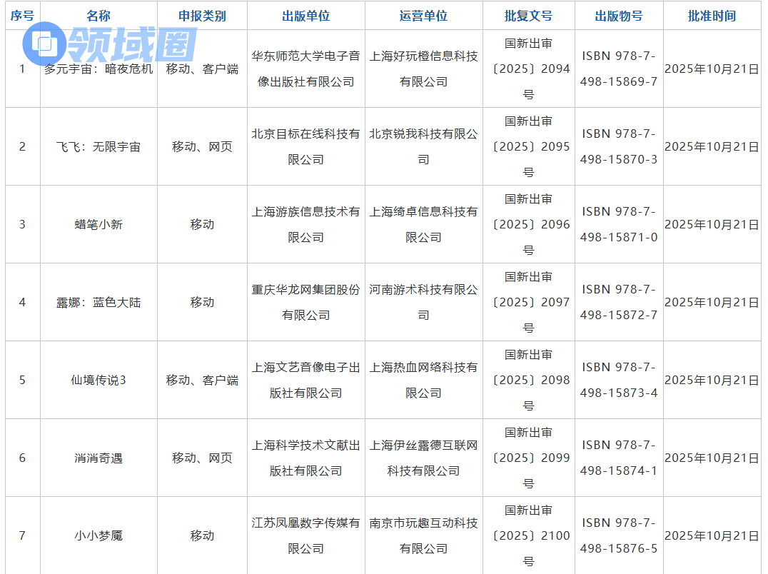2025年10月进口游戏过审分享都已经在上面,感兴趣的小伙伴可以参考本篇攻略,希望能为各位玩家们带来帮助,想要了解更多游戏攻略及资讯请持续关注领域圈游戏。