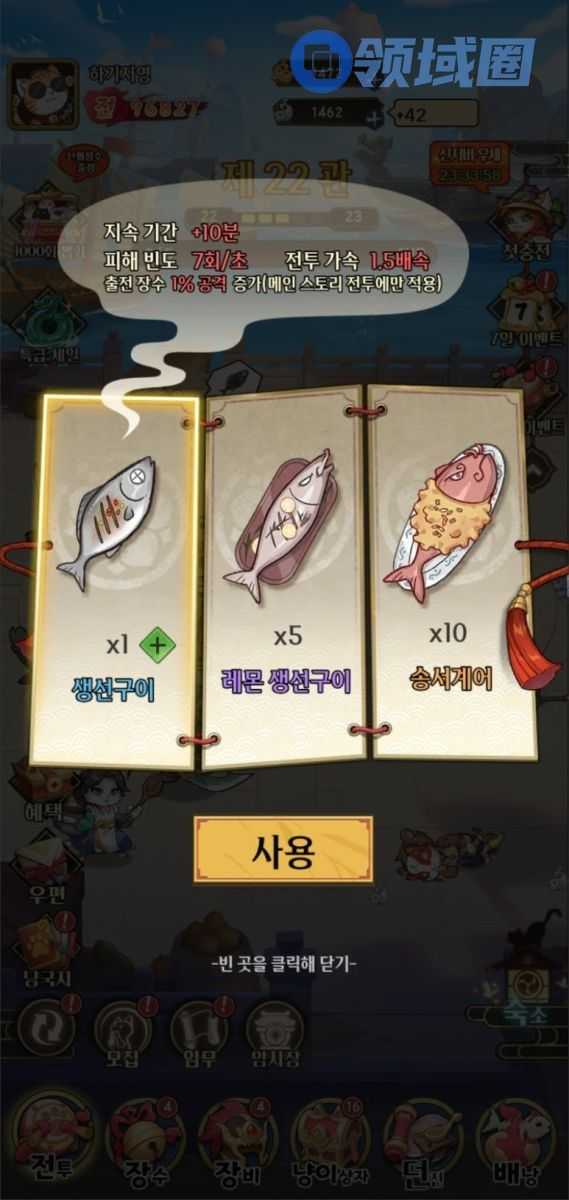 此外,游戏在偏向轻度的回合制卡牌养成的核心玩法上,与放置挂机元素相结合。如游戏刚开始,玩家需上阵 5 个角色进行对局,全程手动释放技能,达到一定阶段后,围绕“猫咪”的主设定,游戏会开放道具“烤鱼”,使用后可开启自动战斗。