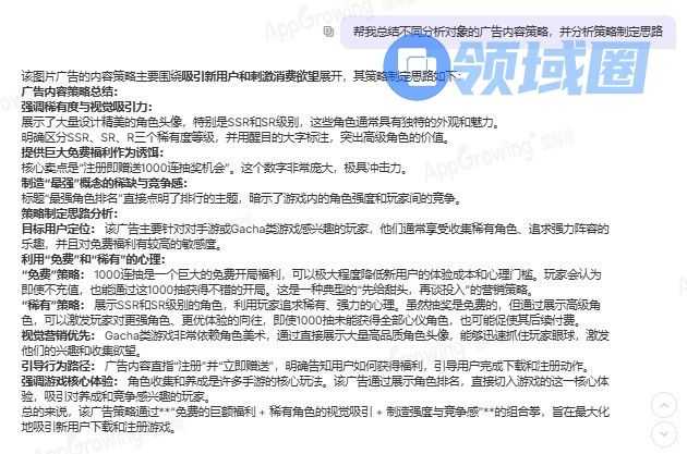 据 AppGrowing 国际版 的 AI 策略分析 功能, 该广告主要针对 Gacha 类游戏(抽卡/扭蛋游戏)感兴趣的玩家,他们通常享受收集稀有角色、追求强力阵容的乐趣,并且对免费福利有较高的敏感度。