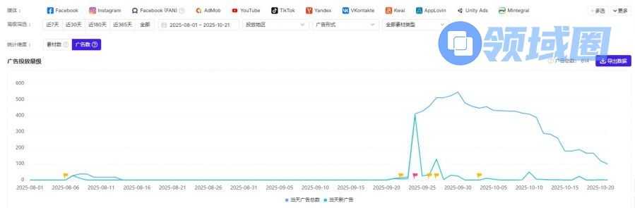 总体来看《喵喵军团》的投放趋势,该游戏在上线前一个半月(8 月初)便以小体量素材进行市场预热与接受度测试,这一动作为后续正式上线的买量策略提供了一定的数据支撑。不过尽管正式上线后投放量有所增加,但买量规模仍控制在相对温和的水平,单日最高达 547 组。