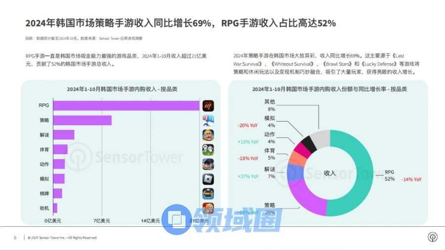 RPG 一直是韩国手游市场吸金能力最强的品类。据 Senor Tower,2024 年 1-10 月 RPG 游戏收入超过 21 亿美元,占韩国手游总收入的 52%。其中,MMORPG 子品类仍是主流,收入占比约 57%,但回合制 RPG 、放置 RPG 等细分品类增长迅速,成为新的增长点。