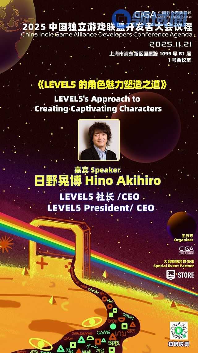 在本次演讲中,日野晃博先生将分享“LEVEL5式角色设定”的理念与方法。从角色设定与世界观的结合,到如何让玩家产生情感共鸣,他将深入探讨角色创作背后的思考与制作故事。