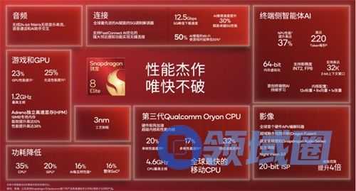 作为“全球最快的移动 SoC”,第五代骁龙 8 至尊版在各个环节都有大幅升级。它采用 3 纳米工艺制程,第三代 Qualcomm Oryon CPU 最高主频达到 4.6GHz,性能提升了 20%,全新架构的高通 Adreno GPU 带来了 23% 的图形性能提升,高通 Hexagon NPU 性能更是提升了 37%。